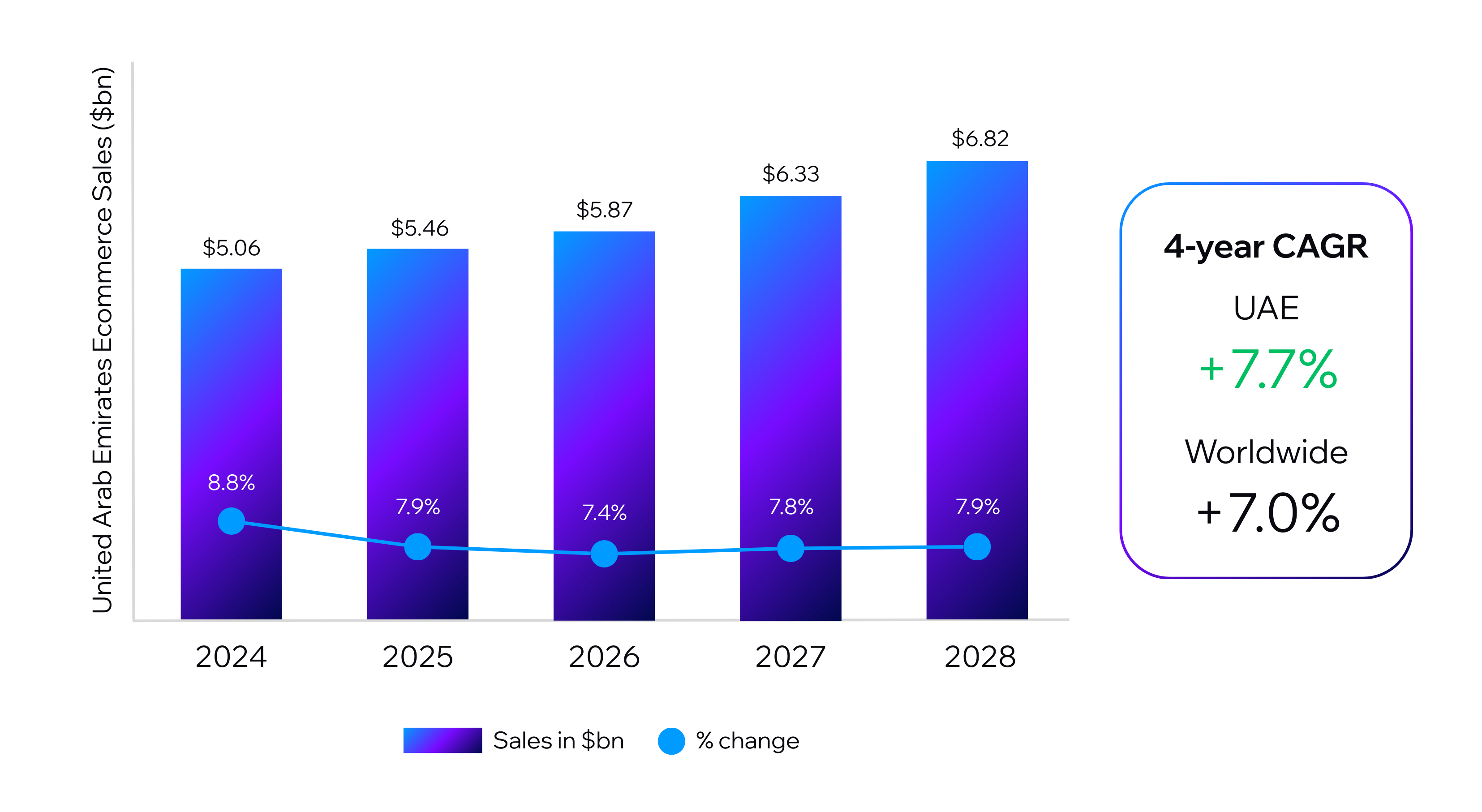 The UAE is outpacing the global ecommerce average, with sales forecast to climb at a 7.7% CAGR over the next four years. That's a step above the worldwide rate. Ecommerce already accounts for a substantial, and growing, share of total retail, with market penetration closing the gap on Europe and North America. Compared to neighbours such as Saudi Arabia and Qatar, the UAE is ahead of the curve.