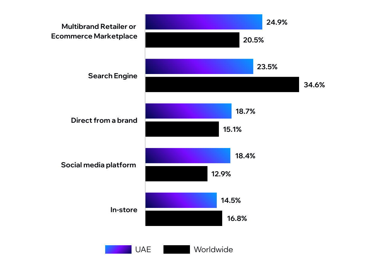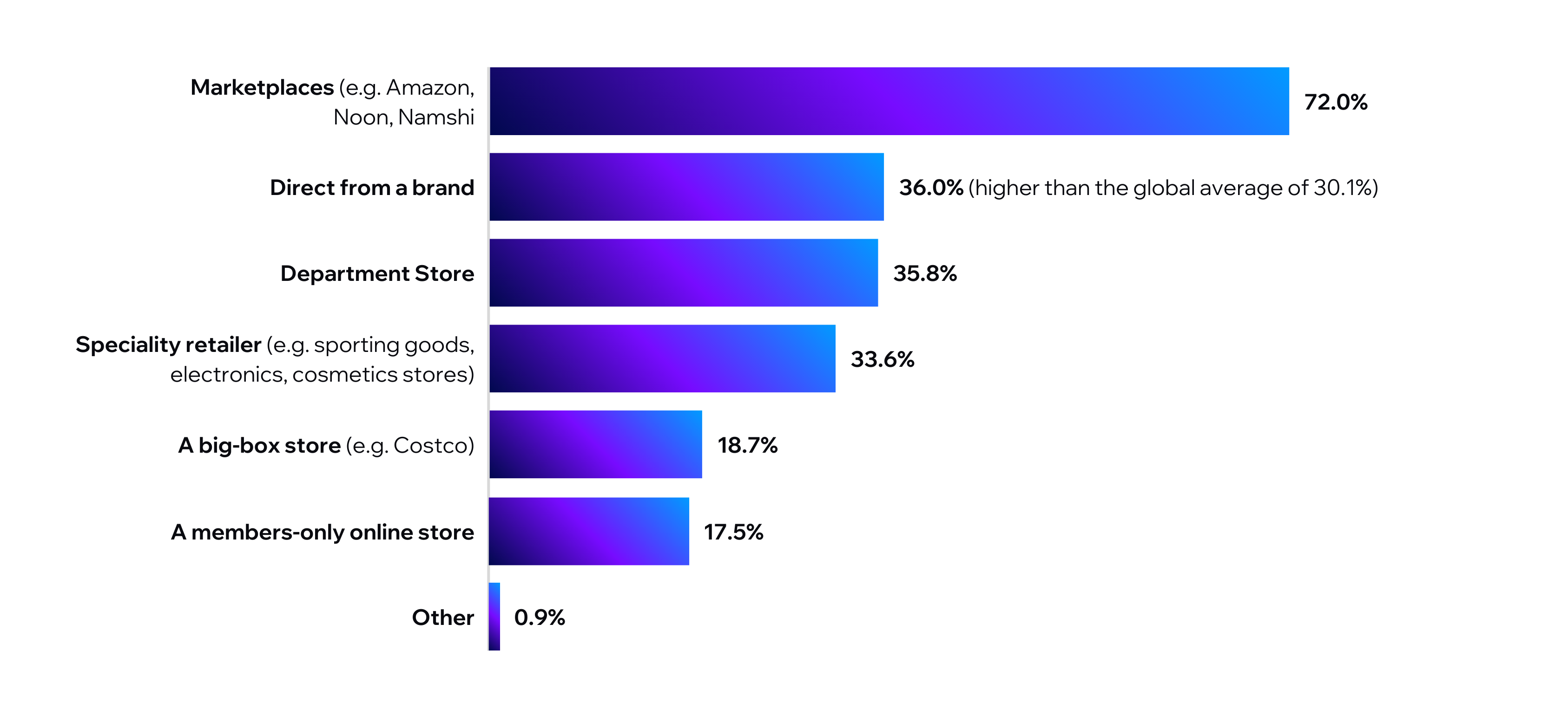 If you’re not mobile-first, you're missing half the market: two-thirds of UAE online sales happen on a smartphone. Marketplaces such as Amazon.ae and Noon.com dominate, but UAE shoppers are also much more likely than global averages to shop directly from brands, especially via social media. Search often starts in a marketplace or on social media, and channels like TikTok and Facebook drive real purchasing decisions.